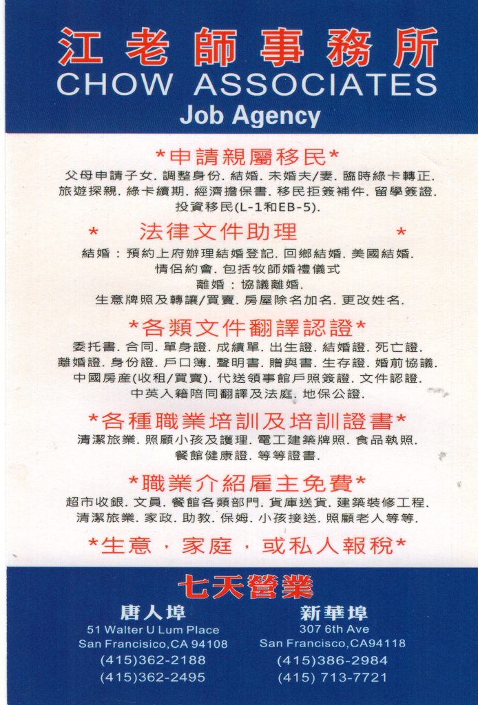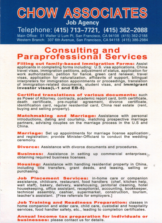 Chow Associates is a personal consulting services agency in the areas of employment and immigration: